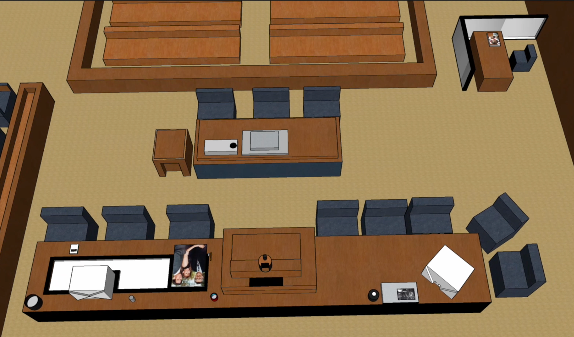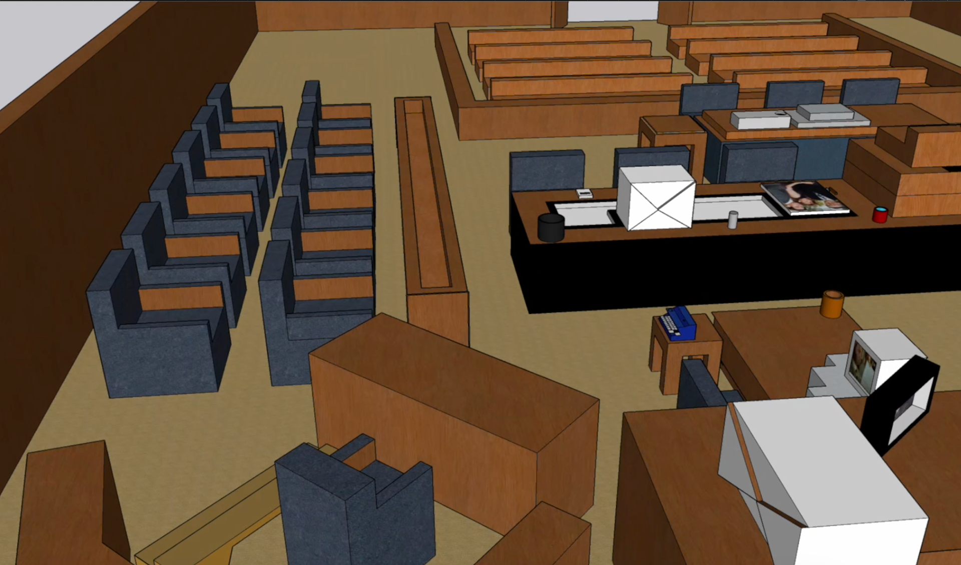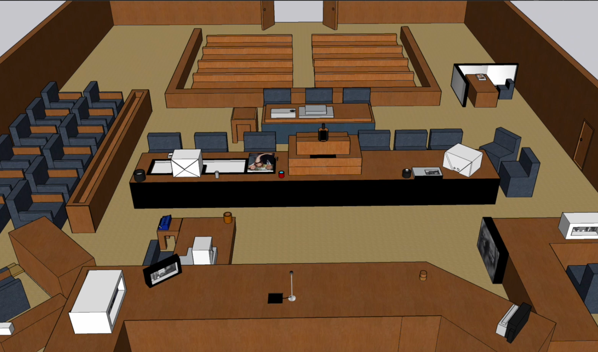 As a companion piece to my investigative newspaper, I developed a 3D digital environment of the courtroom to provide a fully immersive perspective on the O.J. Simpson trial. Driven by a desire to expand my technical skill set, I challenged myself to master SketchUp, using the software to build a detailed and spatially accurate reconstruction of the trial's setting. The objective of this dual-media approach was to bridge the gap between information and experience. While the newspaper provided the granular facts and transcripts, the 3D space offered viewers a sense of presence and scale. By integrating the original audio recordings into this visual environment, I created a sensory experience that allowed the audience to not only read the history but to virtually step into the space where the voices and pivotal moments of the case unfolded.