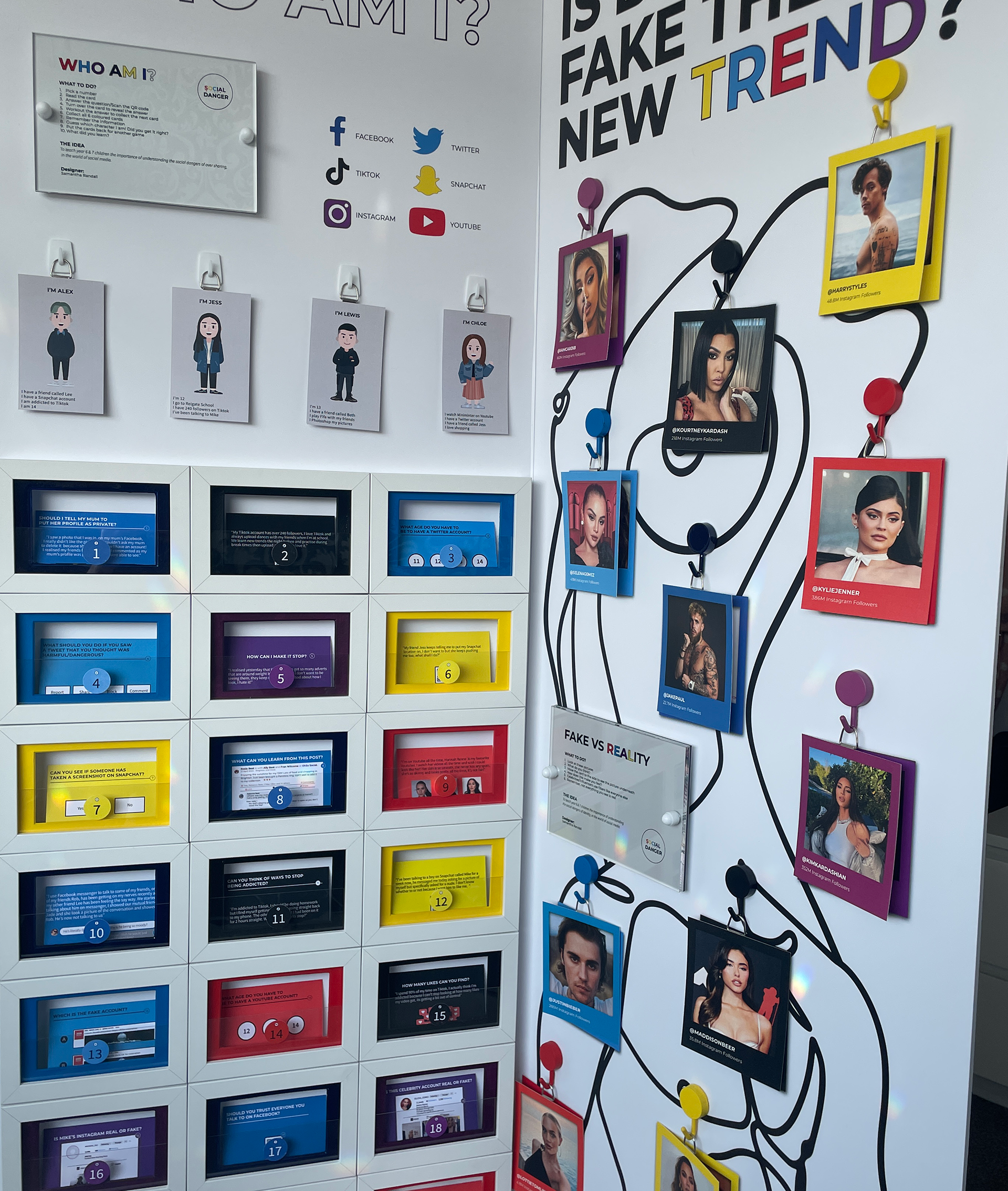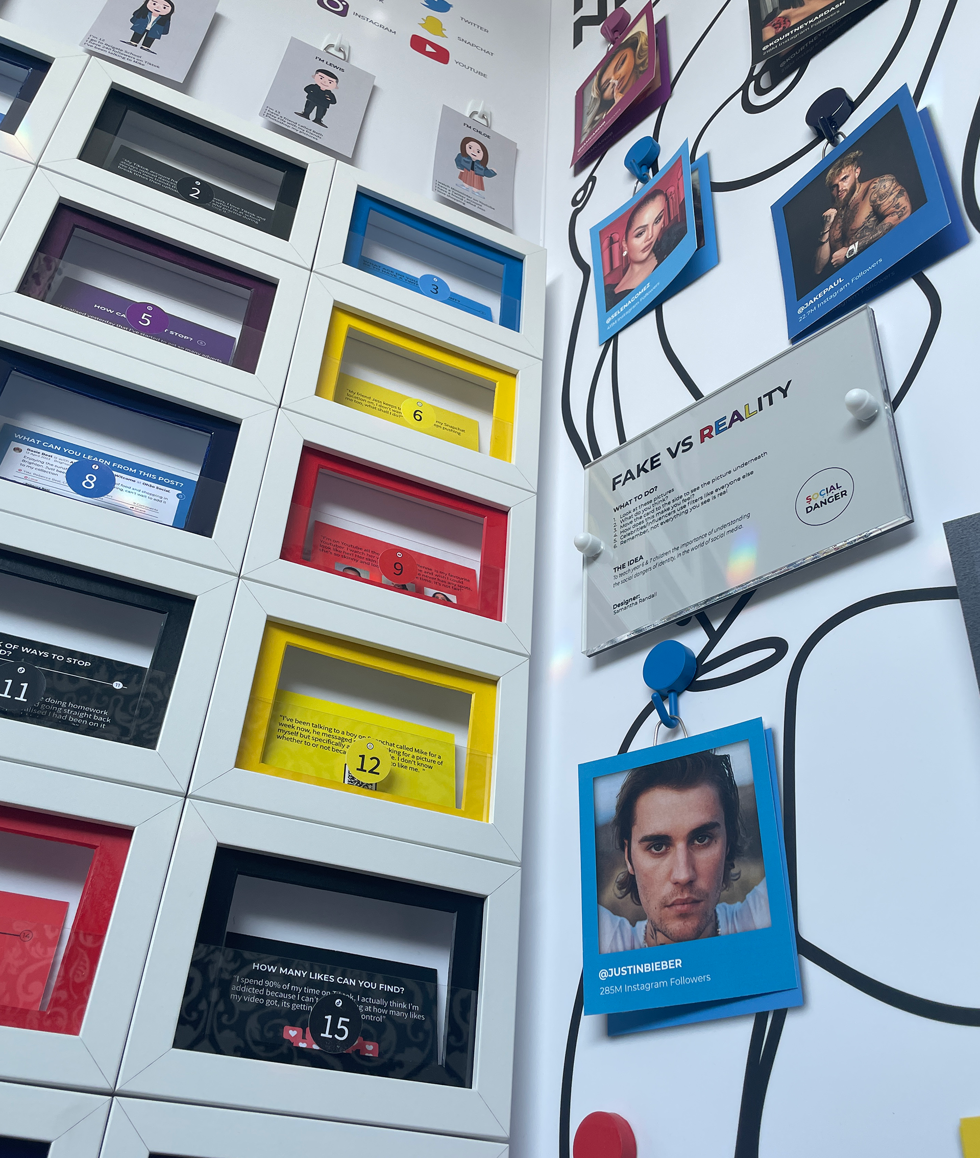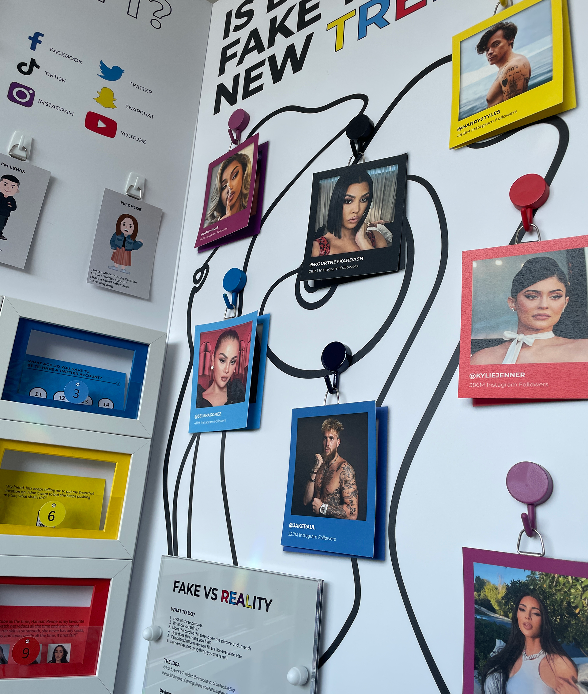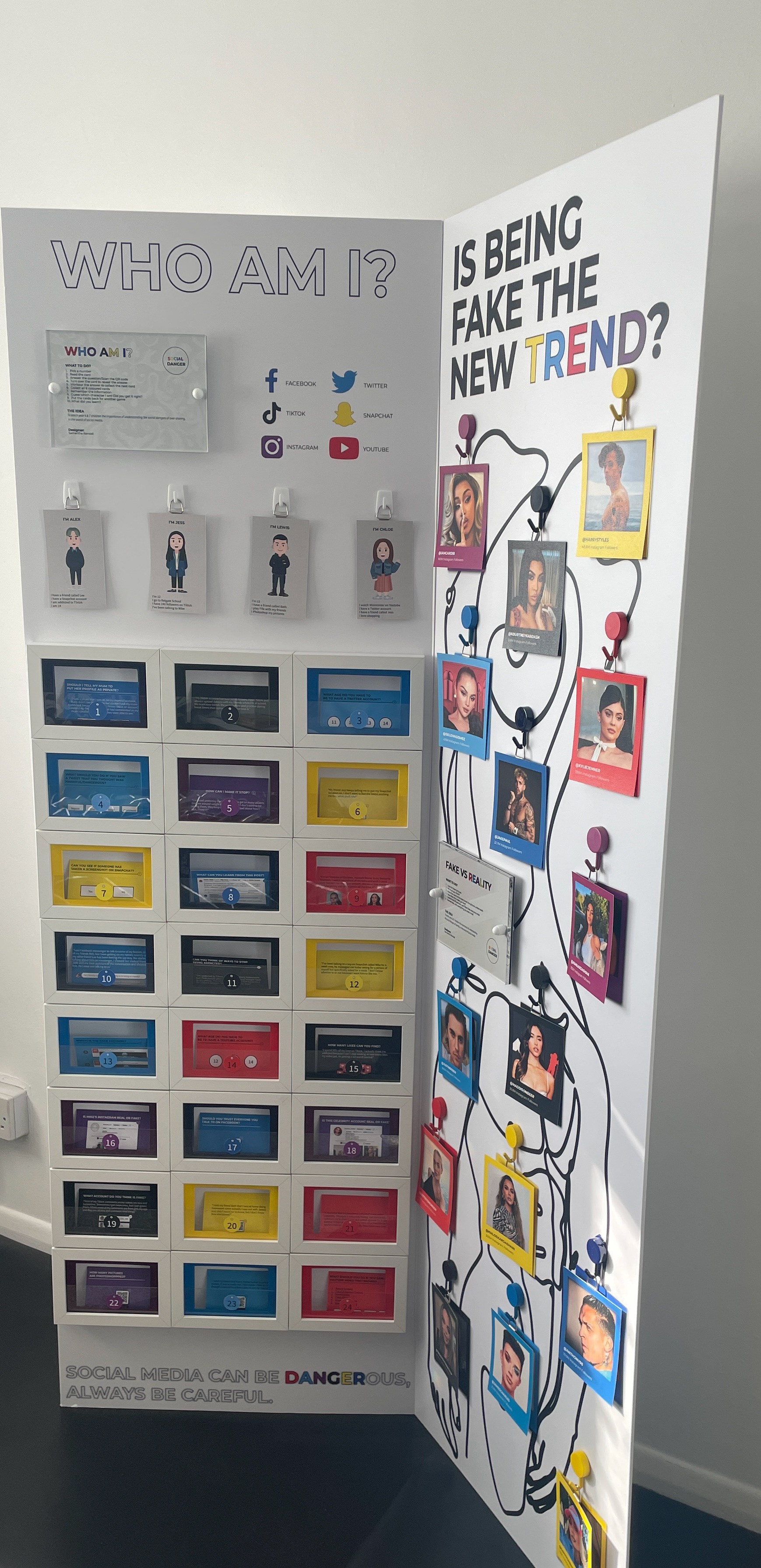 For my final university project, I curated and designed an immersive, interactive exhibition aimed at educating teenagers on the concept of "social fakeness." The exhibition served as a critical exploration of the digital era, specifically exploiting and deconstructing the use of filters in the celebrity world. By peeling back the layers of curated perfection, the installation challenged young viewers to question the unrealistic beauty standards and distorted realities frequently presented on their feeds. A central feature of the exhibition was an original game I developed titled "Who Am I?" This interactive experience was designed to highlight the hidden dangers of the social media world, from identity fragmentation to the psychological impact of constant comparison. By combining physical exhibition design with gamified elements, I created a provocative space that moved beyond passive viewing, forcing the audience to actively engage with the risks of digital life and the importance of authentic self-perception in an increasingly filtered society.