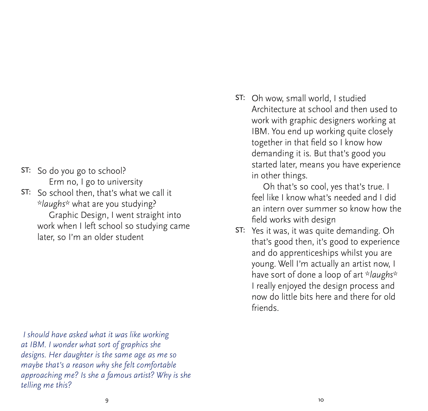 For this project, I transformed a spontaneous interview with a stranger at a bus stop into a miniature editorial book. The piece was designed to be a "natural read" for commuters, capturing the raw, authentic flow of human conversation that often goes unnoticed in our daily routines. To bring the project full circle, I printed and distributed these miniature books at bus stops, leaving them for other commuters to discover. In an era where people are increasingly tethered to their mobile devices, this tactical intervention was designed to encourage a return to basic communication and shared human experiences. By placing a physical narrative in a digital-heavy environment, I aimed to disrupt the typical commute and offer a moment of quiet, analog reflection through the power of storytelling.