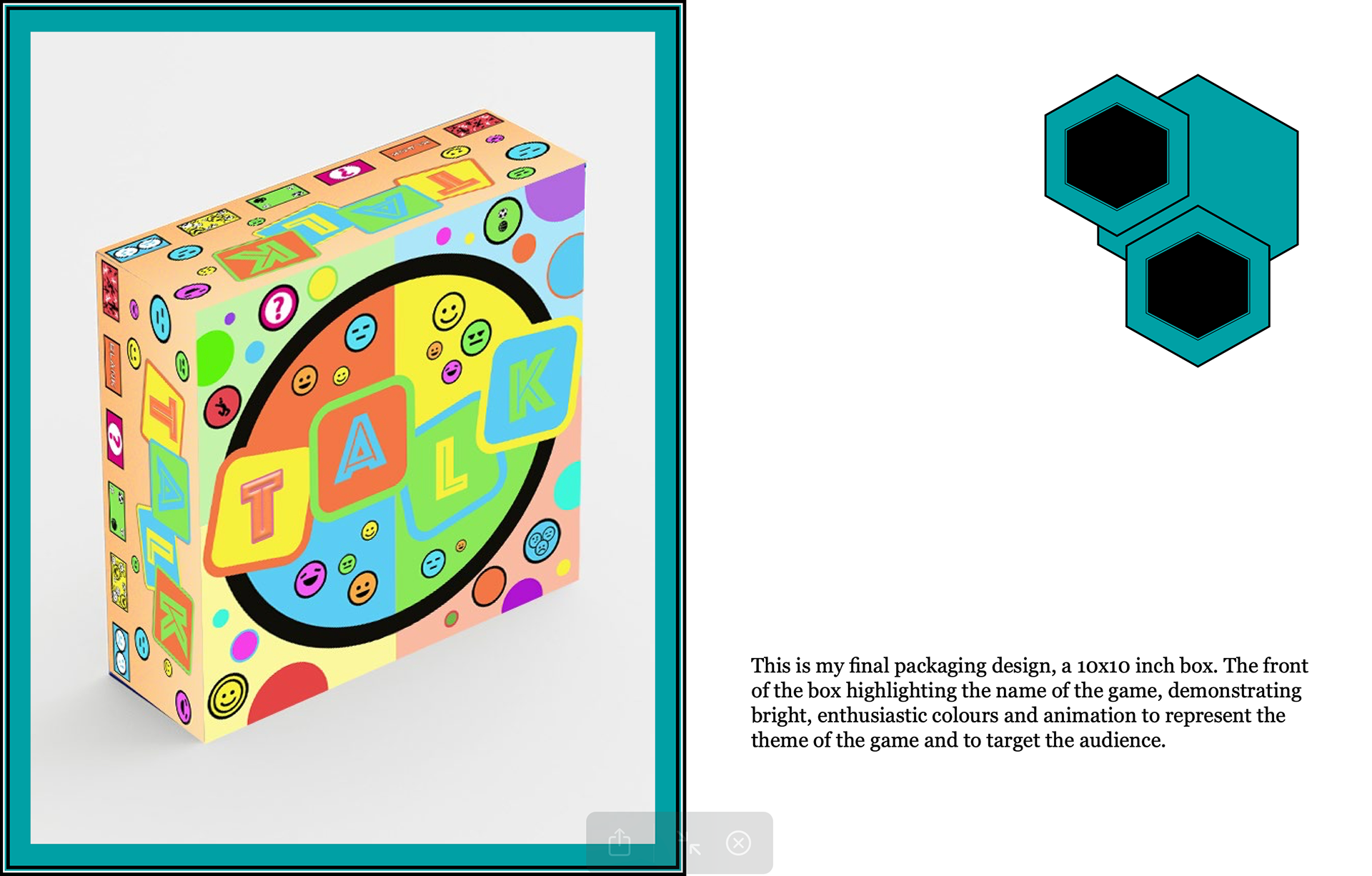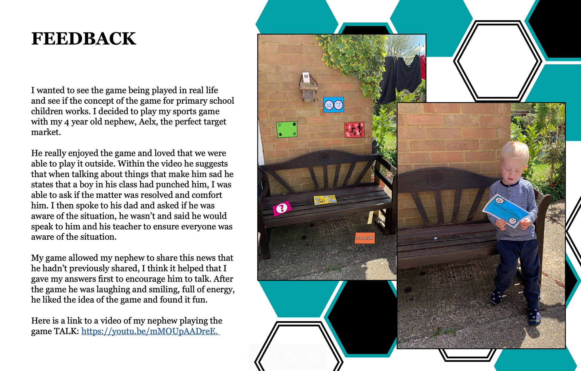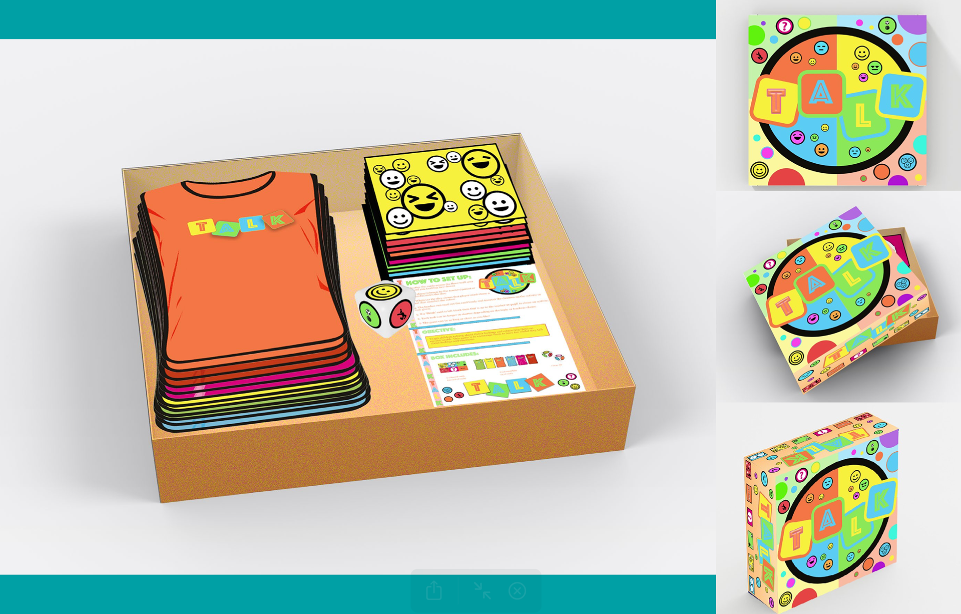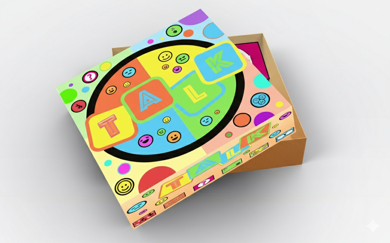 In my first year of university, I developed Talk, an educational board game designed to provide children with a safe, physical space to explore and discuss their mental health. Recognizing the importance of early emotional literacy, I designed the game to be vibrant, accessible, and easy to follow, specifically tailored for use within primary school environments. To ensure the concept was effective and age-appropriate, I conducted hands-on user testing with my four-year-old nephew. This primary research was instrumental in the design process, allowing me to observe firsthand how a child interacts with the mechanics of play and identify which elements best encouraged open communication. The final result was a brightly colored, engaging tool that simplifies complex emotions through the power of play, helping children bridge the gap between their feelings and the words needed to express them.
